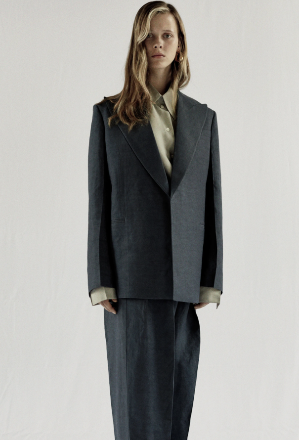 - Oversized notched lapels leading to rear hemline slit