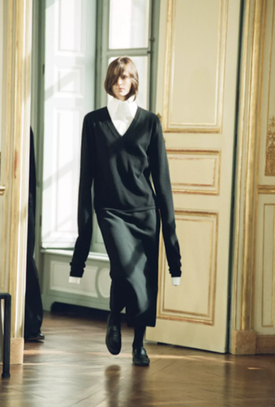 - Rounded neckline leading to a straight silhouette