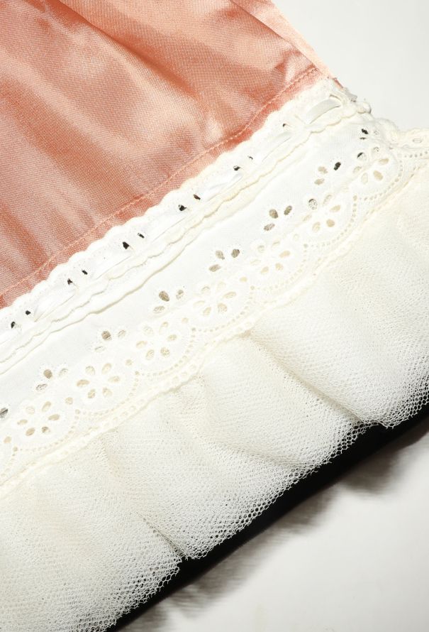- Rear layered crinoline bustle with satin ribbon appliqué