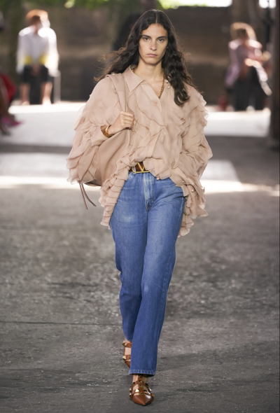- Voluminous sculpted neckline and tiered hemline ruffles