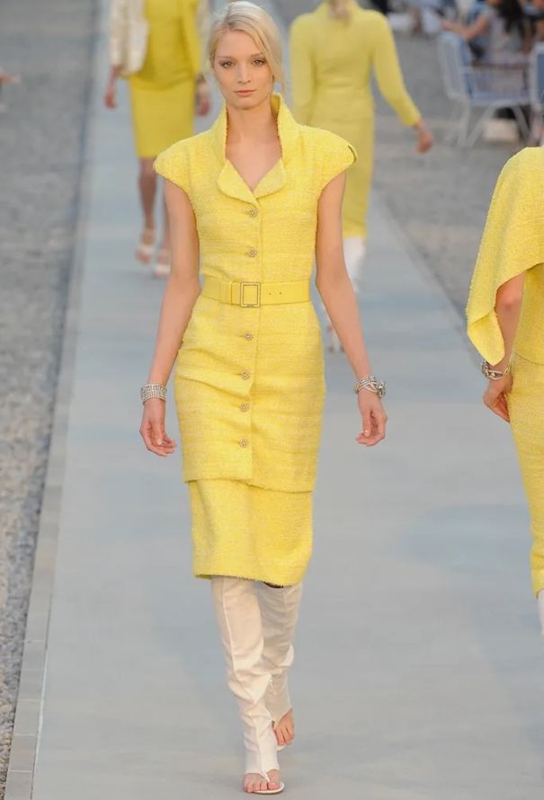- Robe en tweed de coton jaune à simple boutonnage, entièrement doublée.