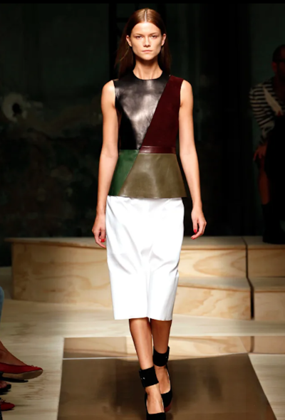 - Manteau bicolore en laine et cachemire avec garniture en cuir
