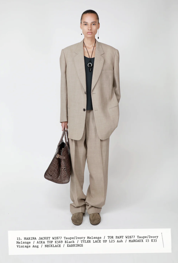 - Costume en grain de poudre de laine beige taupe, entièrement doublé de soie